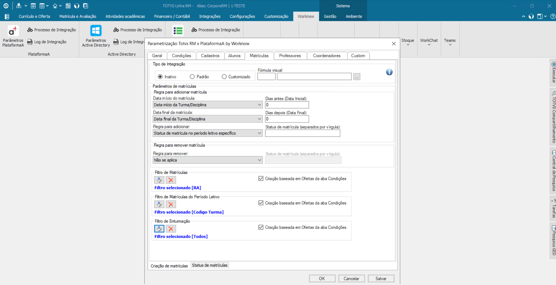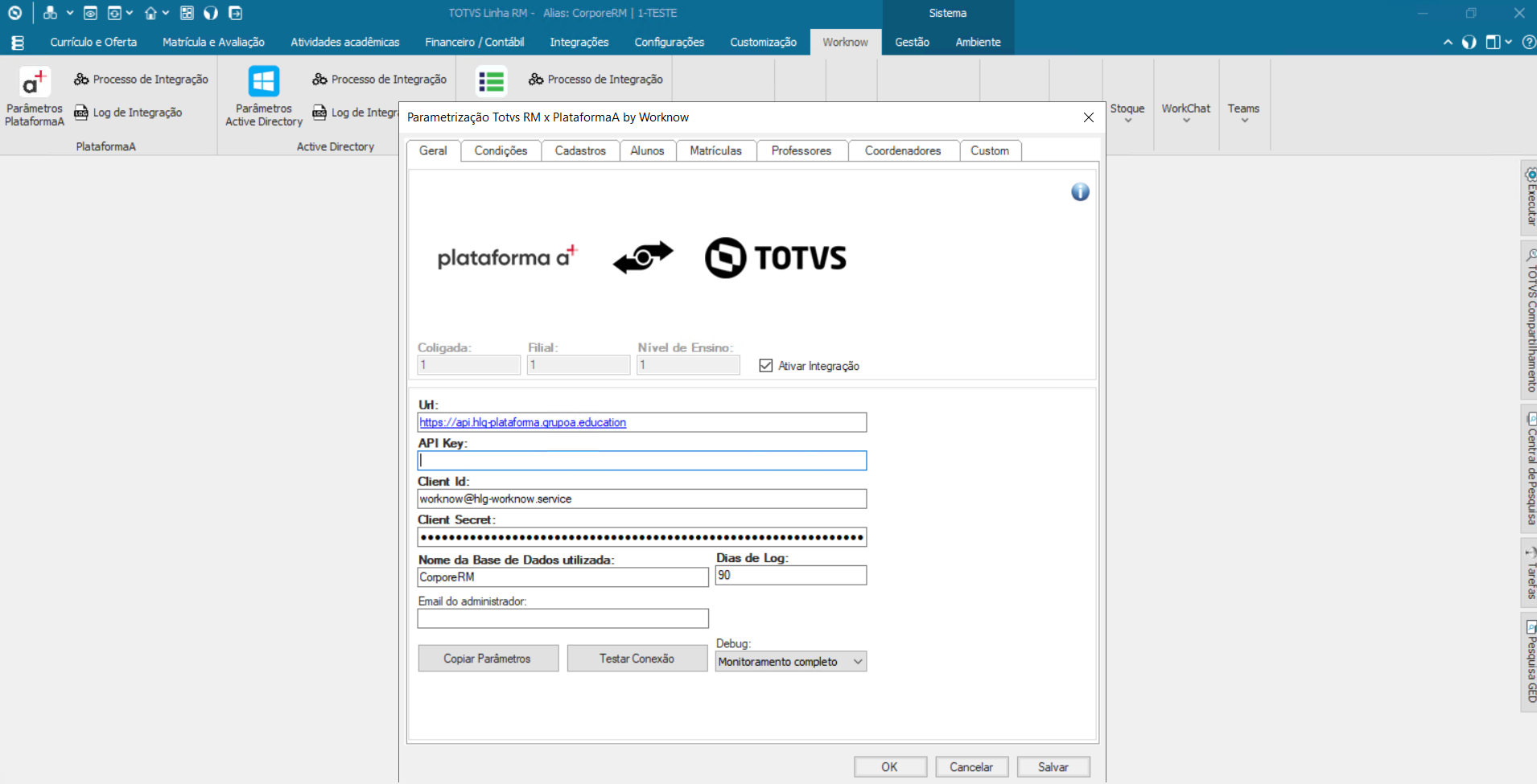 Tela de parâmetros TOTVS Educacional x Plataforma A: