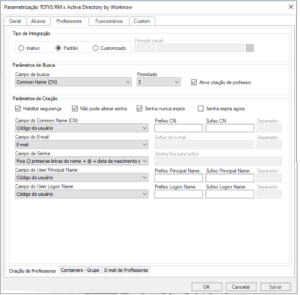 - Padrão: selecionando este campo, o processo de integração irá criar os professores conforme a estrutura parametrizada na grid.
