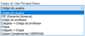 - Código do professor: selecionando essa opção, o integrador utilizará o conteúdo do campo “Código do professor” para compor o “User Principal Name” durante a criação do usuário.