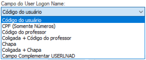 - Código do professor: selecionando essa opção, o integrador utilizará o conteúdo do campo “Código do professor” para compor o “User Logon Name” durante a criação do usuário.