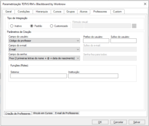 - Padrão: selecionando este campo, o processo de integração irá criar o usuário do “professor” conforme a estrutura parametrizada na grid.