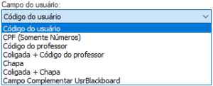 Código do professor: selecionando essa opção, o integrador utilizará o conteúdo do campo “Código do professor” para compor o “Campo do usuário” durante a criação do usuário.