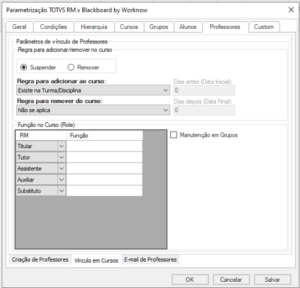 Selecionando essa opção, permite adicionar ou remover professores dos grupos criados pela integração, seguindo as mesmas regras aplicadas em “Vínculo em Cursos”.![]()