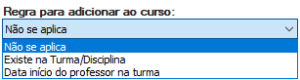 - Existe na Turma/Disciplina: escolhendo essa opção, se o professor estiver inscrito na turma/disciplina vigente será inserido ao curso.