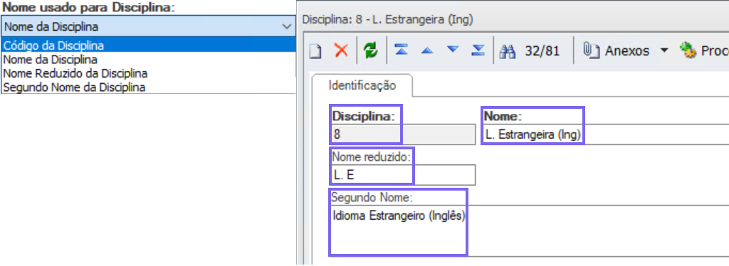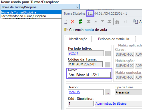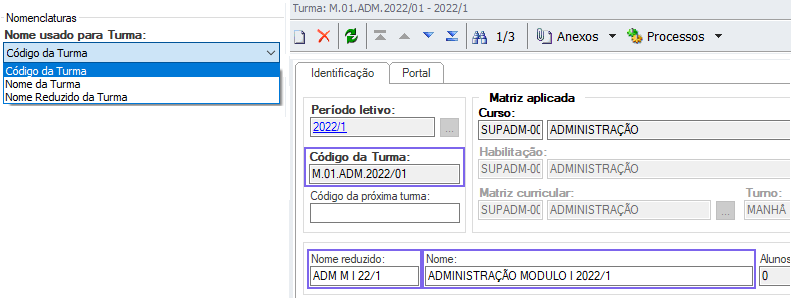 - Nome usado para Turma: Código, nome ou nome reduzido, são configurados conforme localização abaixo.