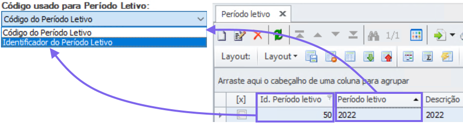 - Código usado para Período Letivo: Assim como para a Disciplina, também é possível indicar qual será a referência de código a ser retirado do cadastro do Período Letivo.