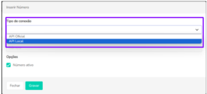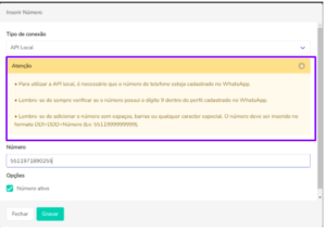 Após selecionar “API Local” como conexão, você deverá cadastrar o seu número seguindo a seguinte formatação: DDD + DDI + Número, sem espaços entre os números. Exemplo: 5511971890255.