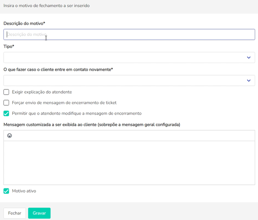 Descrição do motivo: neste campo, defina um nome que identifique a finalidade do motivo cadastrado.