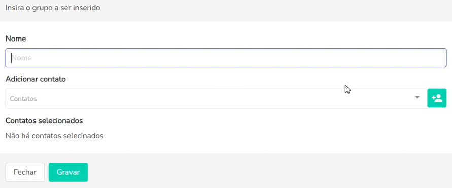 Para adicionar um novo grupo, clique em ‘Novo Grupo’. No campo ‘NOME’, insira uma descrição dos critérios que guiarão o grupo, como por exemplo: ‘Estud. EF II 1º’ ou ‘Respons. Maternal III’.