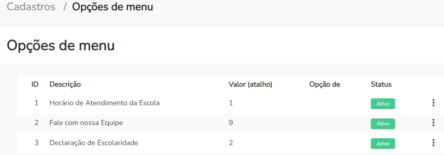 - Enviar menu novamente após seleção da opção: após o aluno receber a resposta, caso este parâmetro esteja marcado, todo o menu estará novamente disponível para seleção.