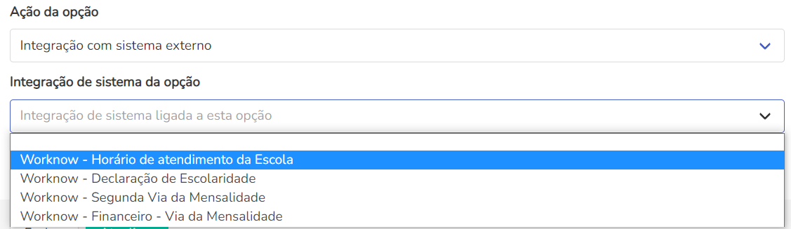 - Integração com sistema externo: utilize esta opção quando o serviço for proveniente de outro sistema. Desta forma, o conteúdo levará em consideração o que já foi cadastrado anteriormente no Menu Integrações.