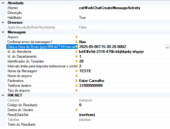 A atividade Envio de Mensagem Agendada (cstEditorSqlWithParametersActivity) permite envio de mensagens agendadas conforme templates do workchat e ou customizadas.