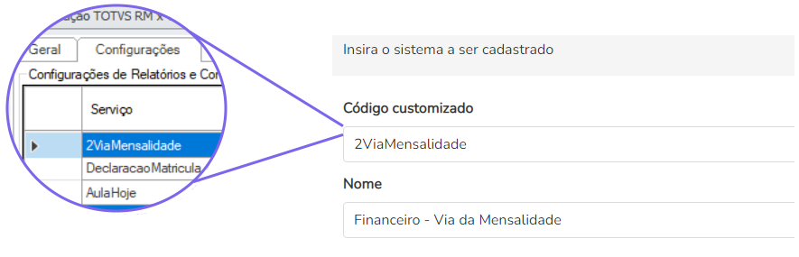 •  Campo “Código Customizado“: corresponde ao campo Serviço cadastrado nos parâmetros da Integração no TOTVS Educacional.