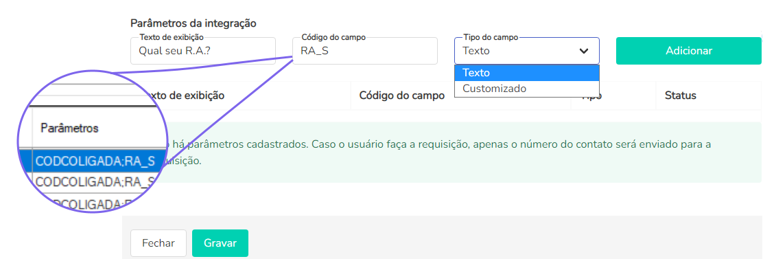 Tipo do campo: selecione Texto caso o parâmetro requisitado necessite de uma resposta simples do usuário, como por exemplo, um registro acadêmico ou ainda um número de CPF.