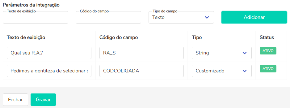 Código do campo: essa informação corresponde à coluna Parâmetros dentro das configurações da integração no  TOTVS Educacional. Dessa forma, deve existir uma linha para cada registro.