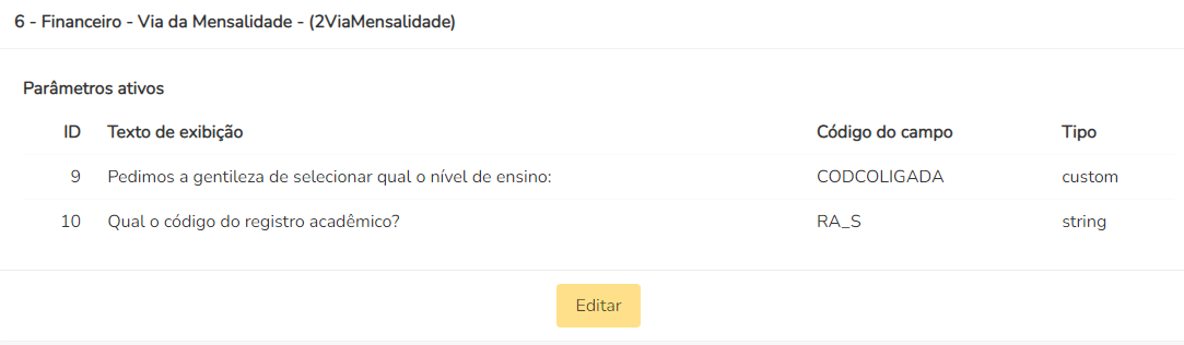 Clique em Editar para alterar informações e/ou incluir novos parâmetros.