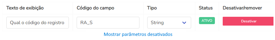 Uma vez salvo e em utilização, não é possível excluir parâmetros, apenas Desativar.