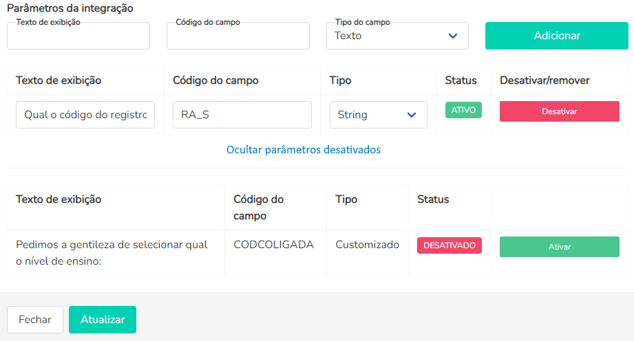 Código customizado: Corresponde ao campo Código do Sistema que foi informado nos parâmetros da integração dentro do TOTVS Educacional.