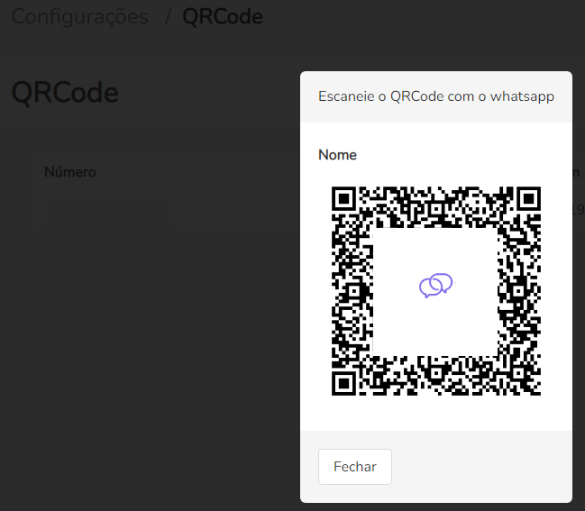 Ao clicar em “Mapear QR Code“, um QRCode é exibido em tela para escanear e acessar as funcionalidades do WhatsApp Business: