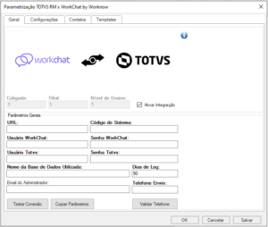 Na guia geral configura-se os dados essenciais para o funcionamento da integração. Estes dados permitirão que o TOTVS Educacional esteja conectado com o ambiente do Workchat.