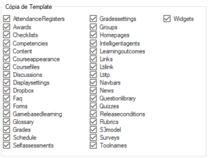 - Widgets: componentes adicionais ou elementos visuais interativos. A cópia trará os widgets do curso modelo para o curso alvo.