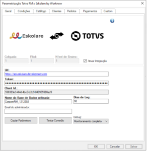 Na guia geral configura-se os dados essenciais para o funcionamento da integração. Estes dados permitirão que o TOTVS Educacional esteja conectado com o ambiente do Eskolare.