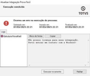 • Caso seja apresentado um erro semelhante ao exibido abaixo, é necessário verificar se as liberações de firewall e proxy foram realizadas para as urls informadas pela worknow. Mesmo assim apresentando erros, verifique com nosso time a liberação de Licença.