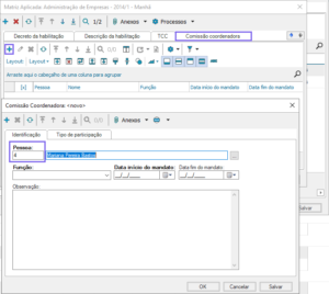 Na tela “Comissão Coordenadora“, encontrará o campo para criar e definir o cadastro de um coordenador.