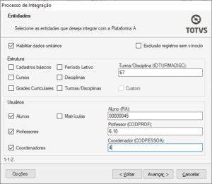Importante: Sem a utilização deste recurso, todos os coordenadores, professores e alunos vinculados a estrutura serão integrados de acordo com as configurações que foram realizadas nos Parâmetros. |