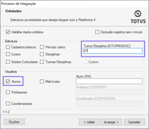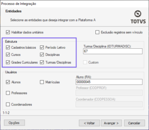 Atenção: Independentemente da condição do campo Turma/Disciplina, é necessário ativar pelo menos uma opção da estrutura para realizar a integração. |