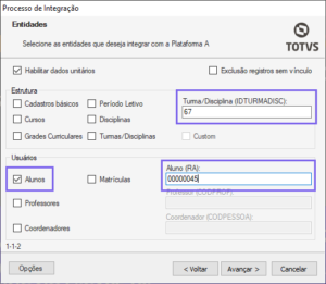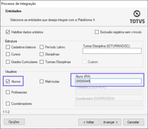 É possível integrar somente um Aluno (RA) ou mais (separando os códigos por vírgulas).