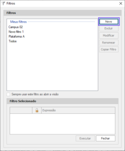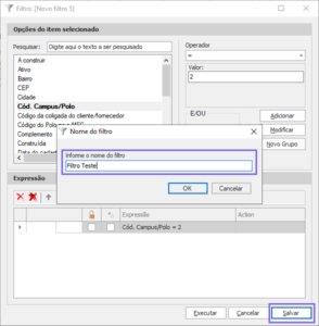 Abrirá uma tela para realizar as configurações do novo filtro.