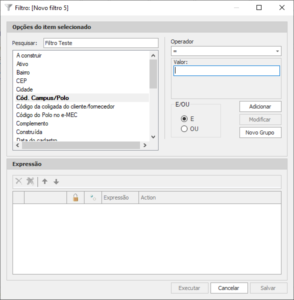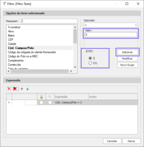 Próximo passo: defina o registro a ser buscado no campo “Valor” e selecione o operador lógico ‘E/OU’ que melhor se adapte ao filtro.