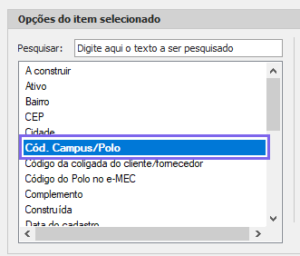 Escolha entre as opções disponíveis o item que deseja buscar, como por exemplo “Cód. Campus/polo“.
