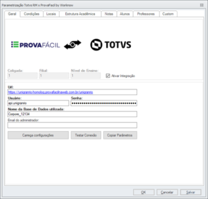 Na guia geral configura-se os dados essenciais para o funcionamento da integração. Estes dados permitirão que o TOTVS Educacional esteja conectado com o ambiente do Prova Fácil.
