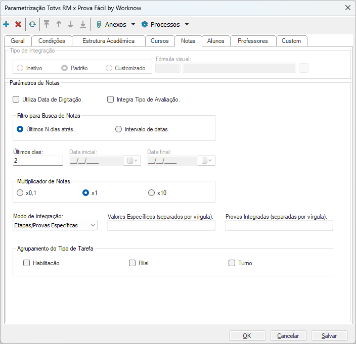 O agrupamento do Tipo de tarefa concatena o valor marcado Habilitação, Filial e/ou Turno marcado ao código da disciplina a ser enviado na atualização de notas para o prova fácil.